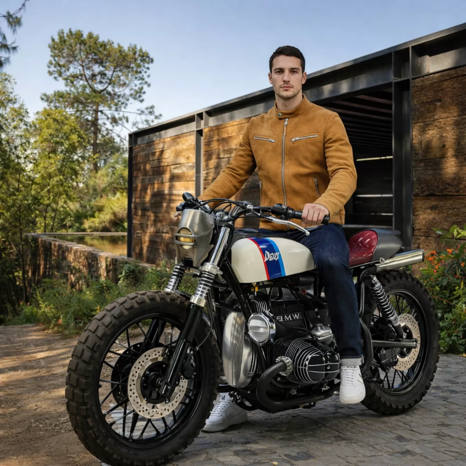 Inspirado en la escena biker de los años 60 y en los códigos atemporales del mundo ecuestre, el Blusón de Piel de Ante Krono Polo une dos estilos de vida marcados por la libertad, la artesanía y la personalidad. Pensado para quienes se mueven con naturalidad entre las caballerizas y la carretera abierta, combina carácter rebelde con una elegancia contenida.