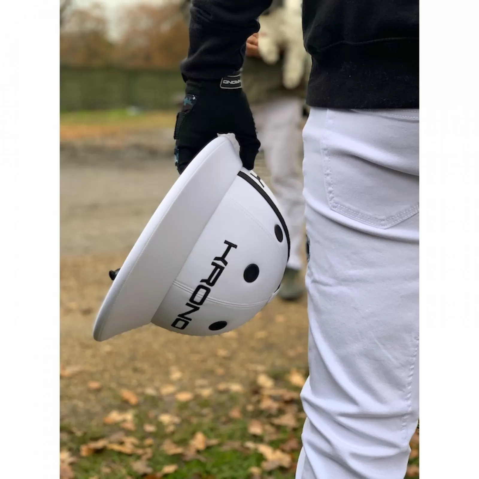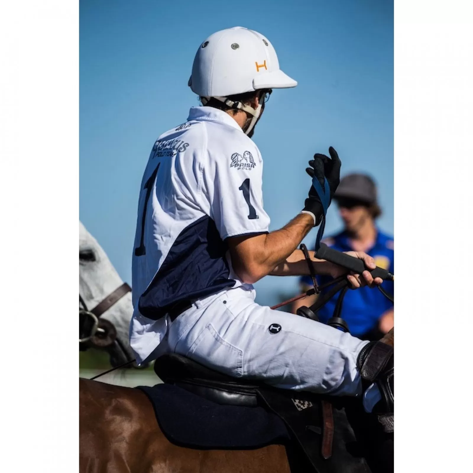 El casco de polo blanco en piel es una de las combinaciones de color / tejido más tradicionales que utilizan actualmente los jugadores de polo. Cuando se juega al polo competitivo durante el calor del verano, el cuero blanco mantiene fresca la cabeza del jugador.