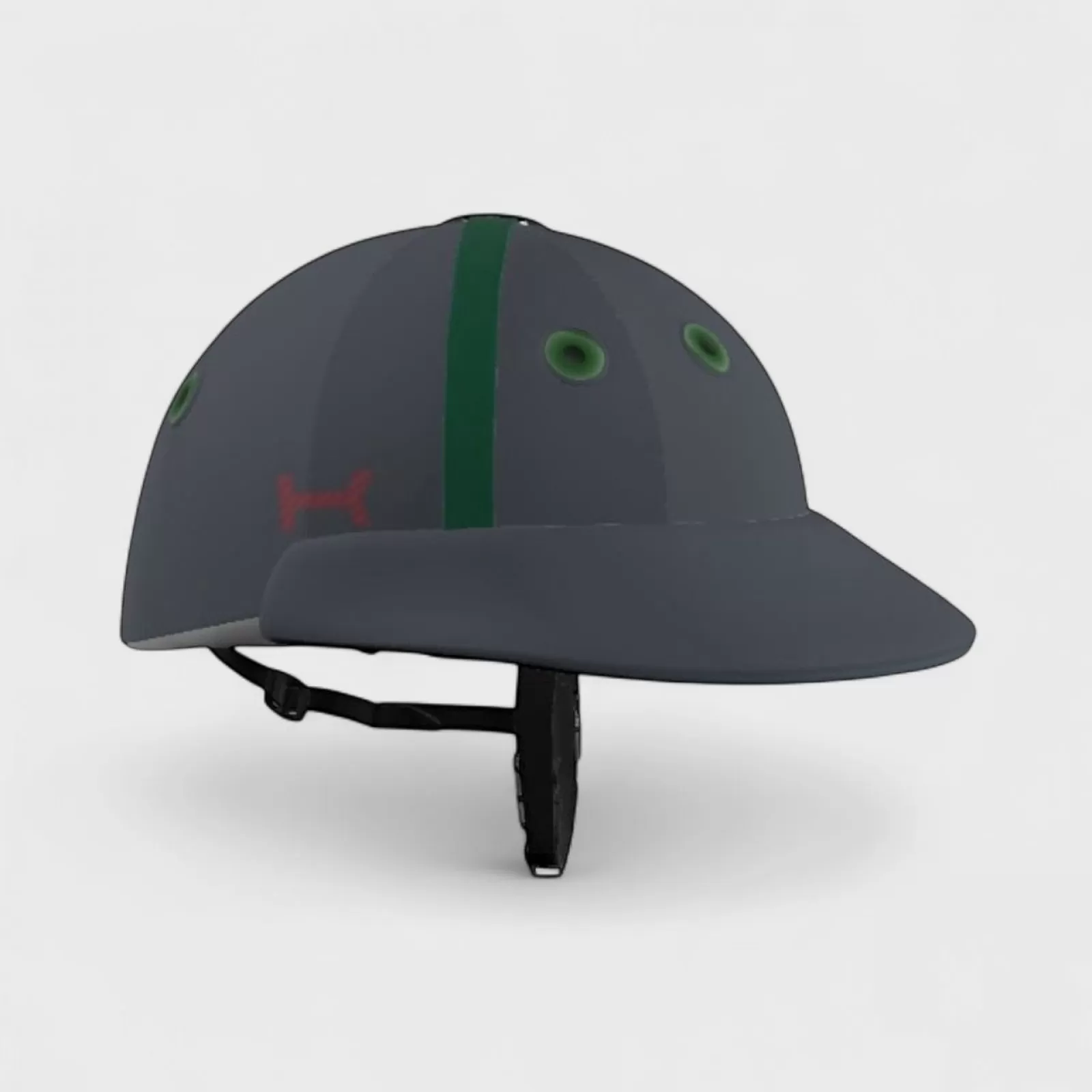 Destaca dentro y fuera de la cancha con este casco de polo en gris oscuro, realzado con ojales y correas verdes y un bordado «K» rojo. Diseñado específicamente para el polo, combina una estética moderna con protección fiable y confort durante todo el día, ideal para entrenamientos, partidos de club y torneos.