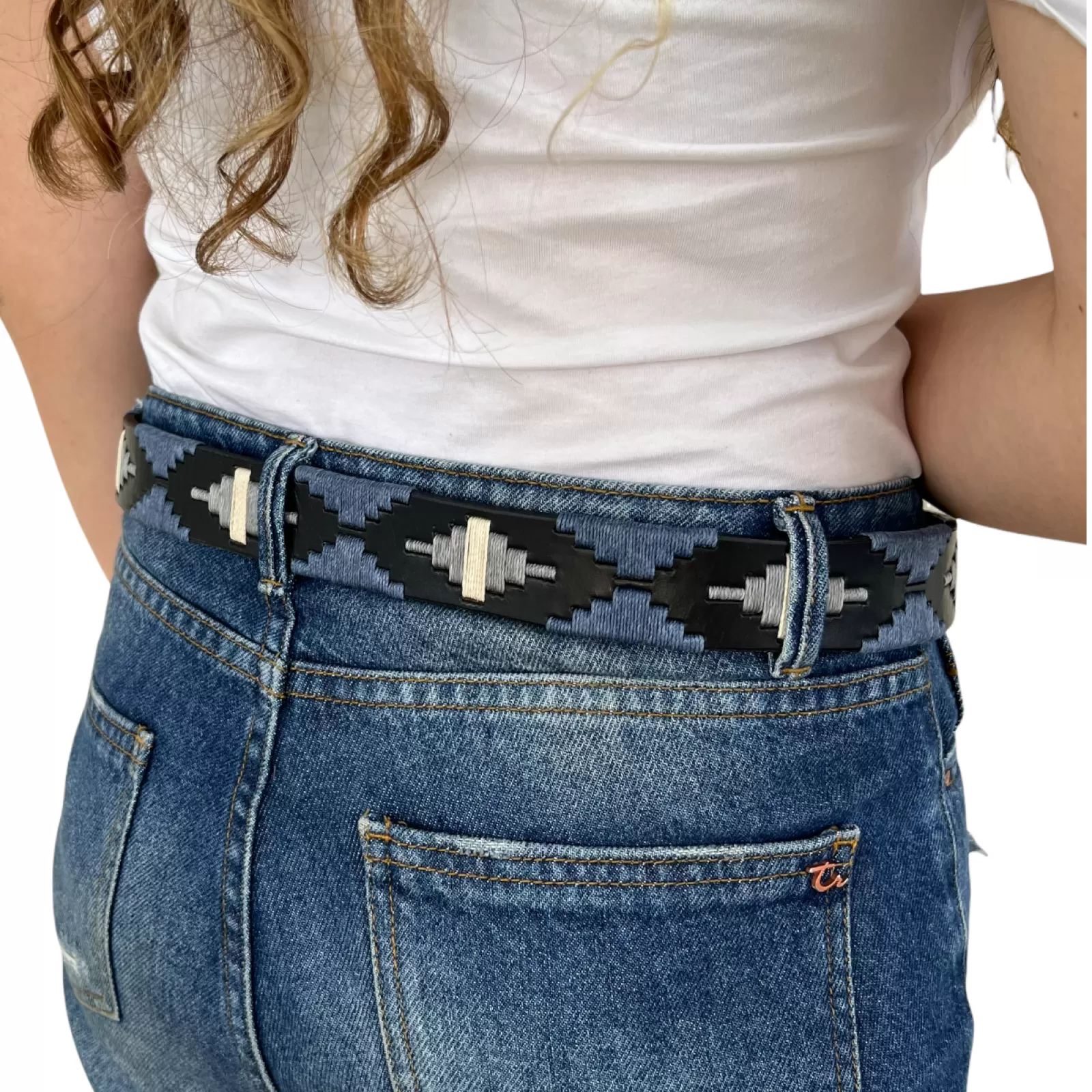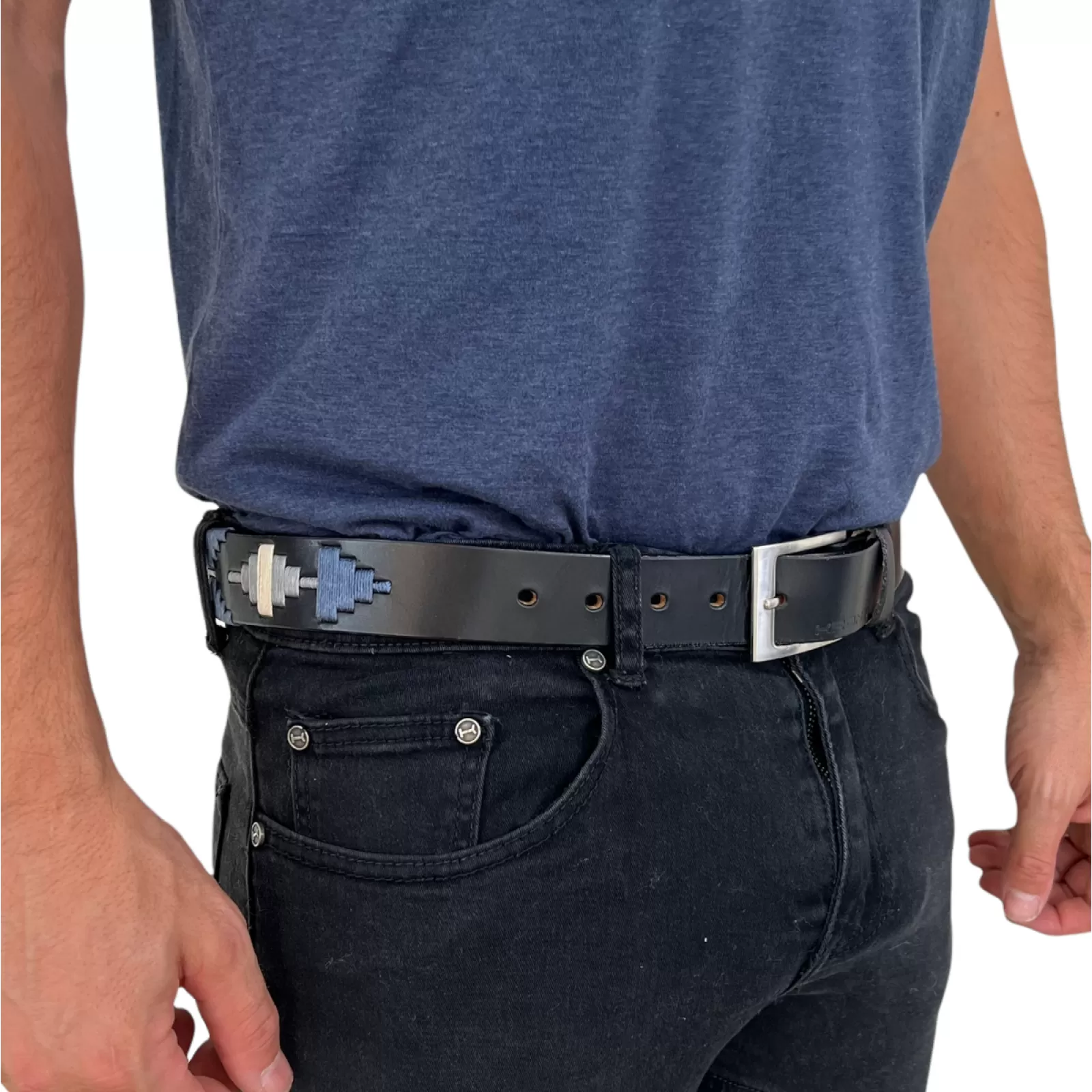 Un accesorio formado por diversos patrones tejidos a mano, este cinturón ha sido diseñado en colores discretos como el azul marino y azul claro que complementarán de manera única múltiples prendas como jeans, pantalones de polo o vestidos. La hebilla color latón antiguo acompaña perfectamente el cuero en tonalidad azul profundo, sus “diamantes aztecas” en diferentes patrones reviven la magia de la Cordillera de los Andes que se pierde en el cielo nocturno.