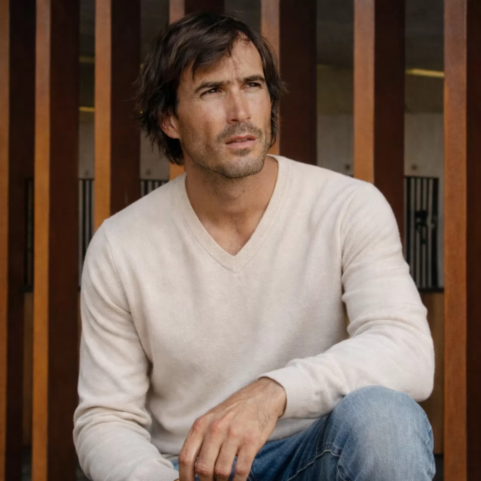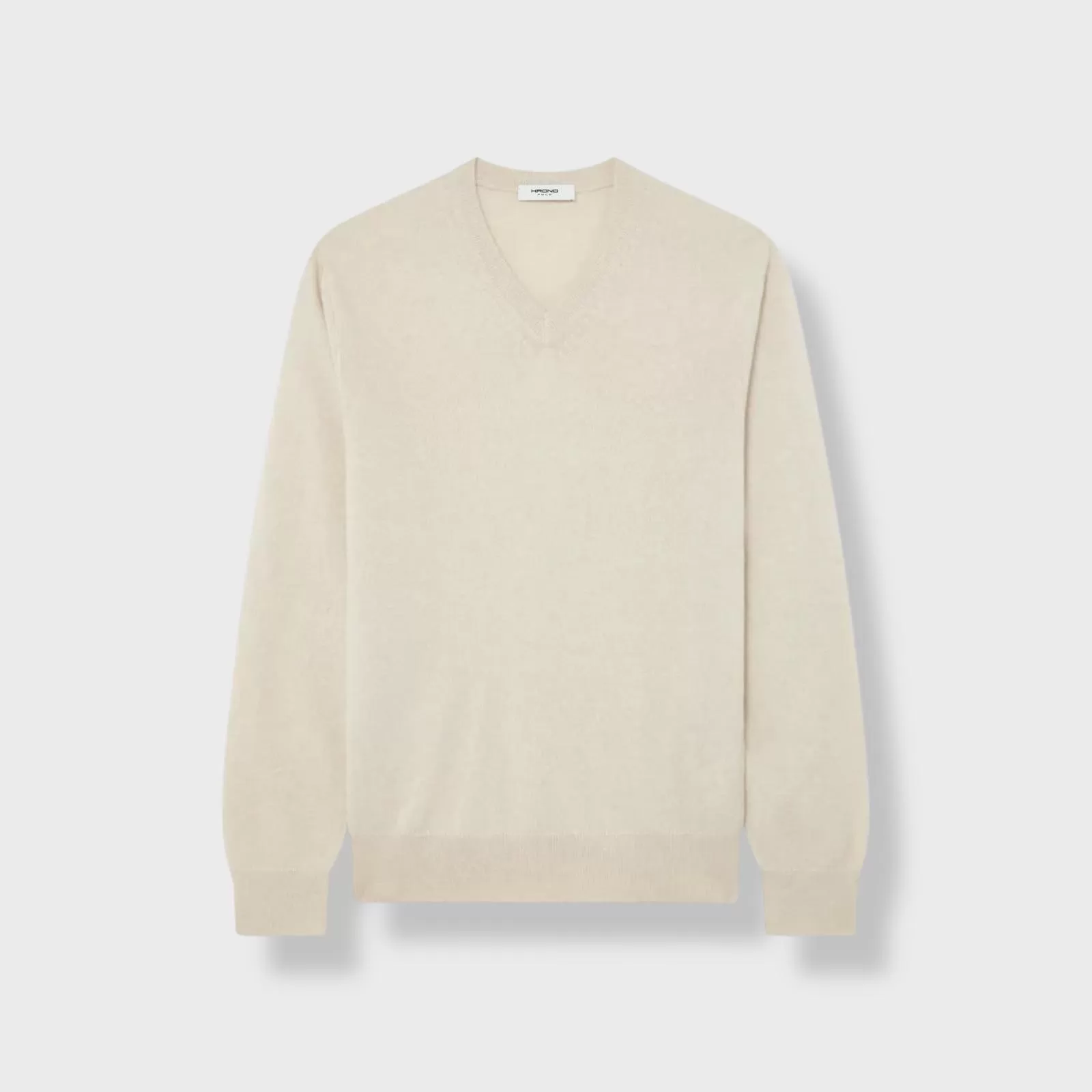 Con su cuello en V limpio y un corte regular bien equilibrado, ofrece una silueta relajada pero refinada. El tono beige claro evoca paddocks bañados por el sol, tardes tranquilas en la cuadra y la elegancia natural de los viajes entre torneos en climas cálidos. Fácil de combinar sobre una camisa o bajo una chaqueta, se adapta perfectamente tanto a vaqueros como a pantalones más formales.