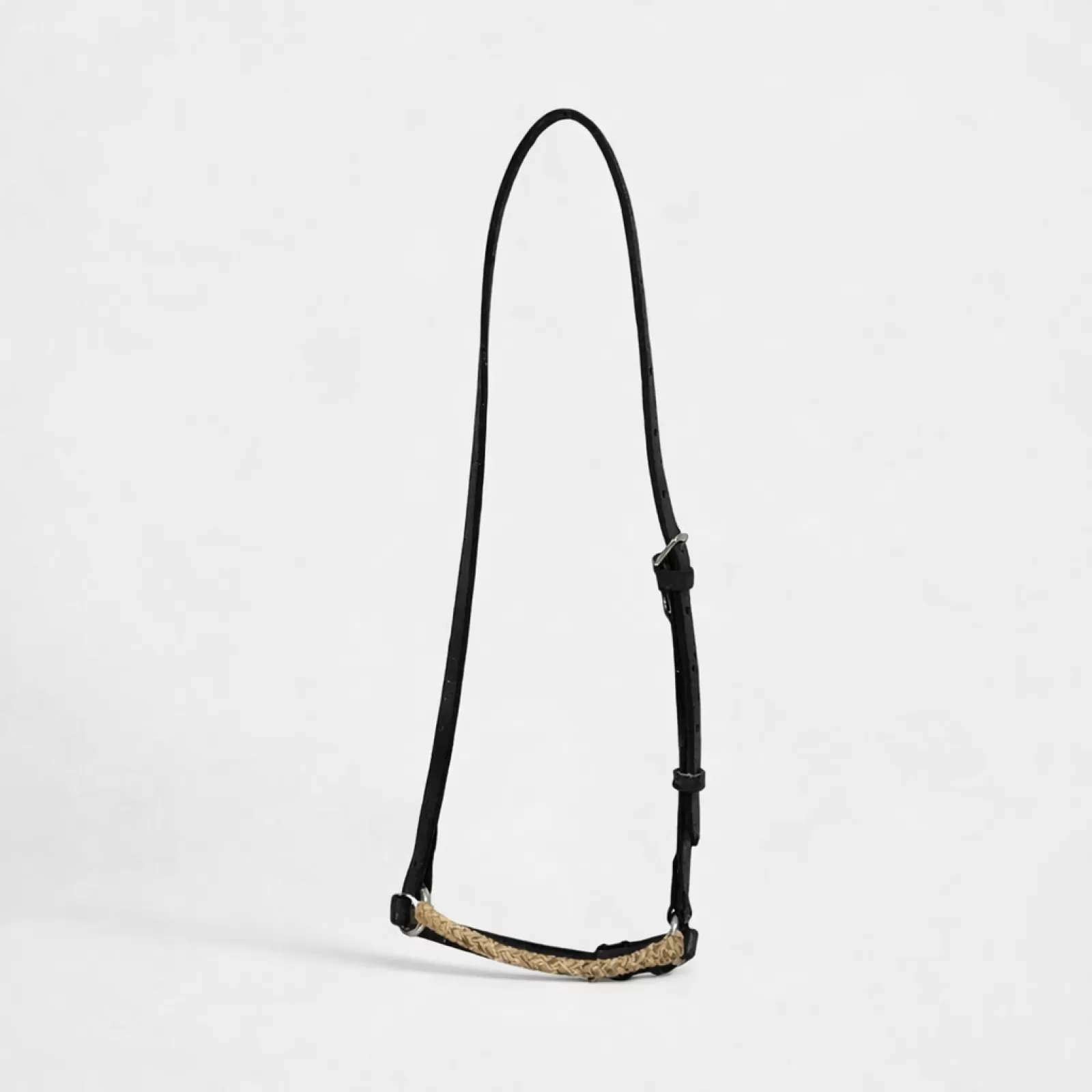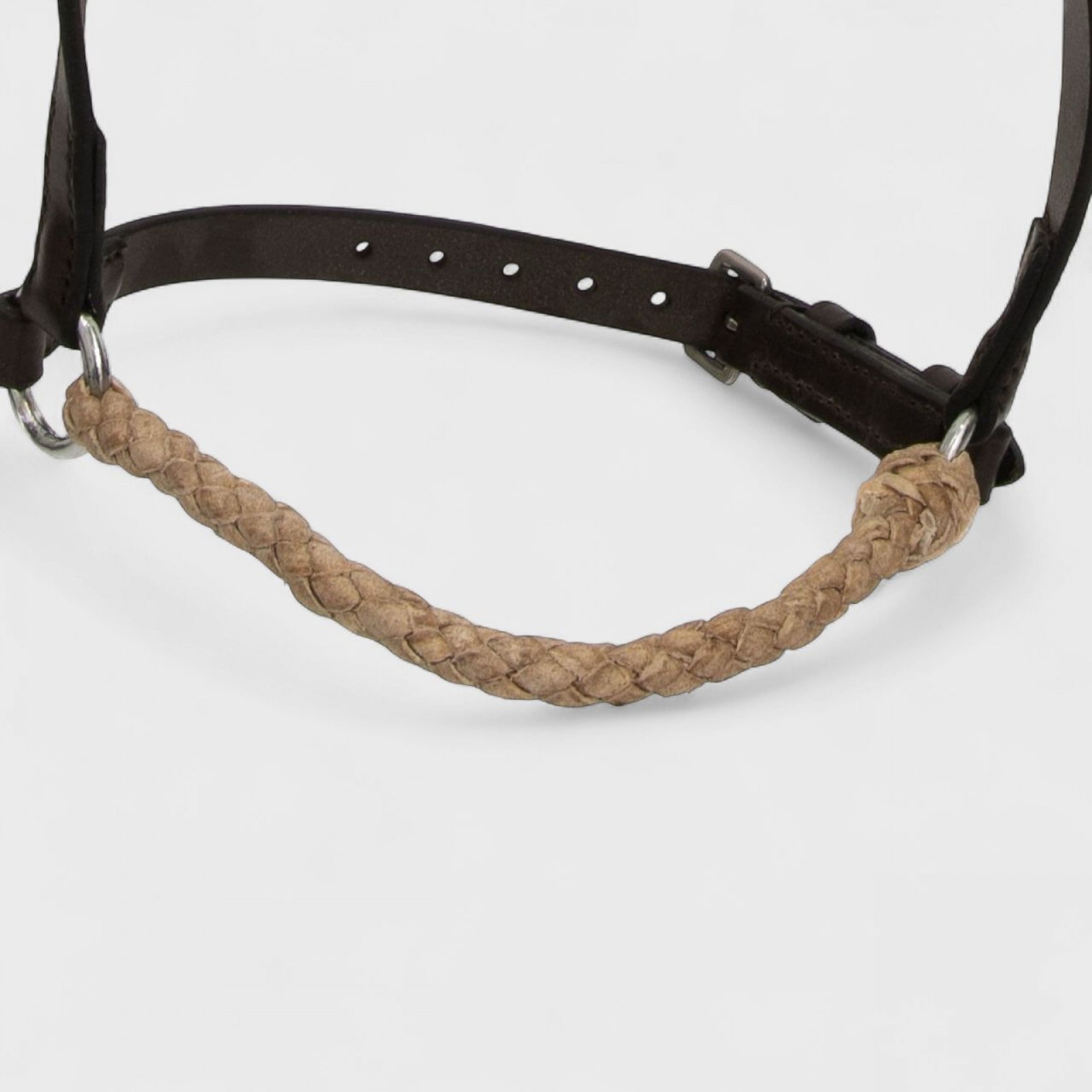 Muserola baja de cuero con detalles de crin trenzada a mano y hebillas de acero inoxidable.